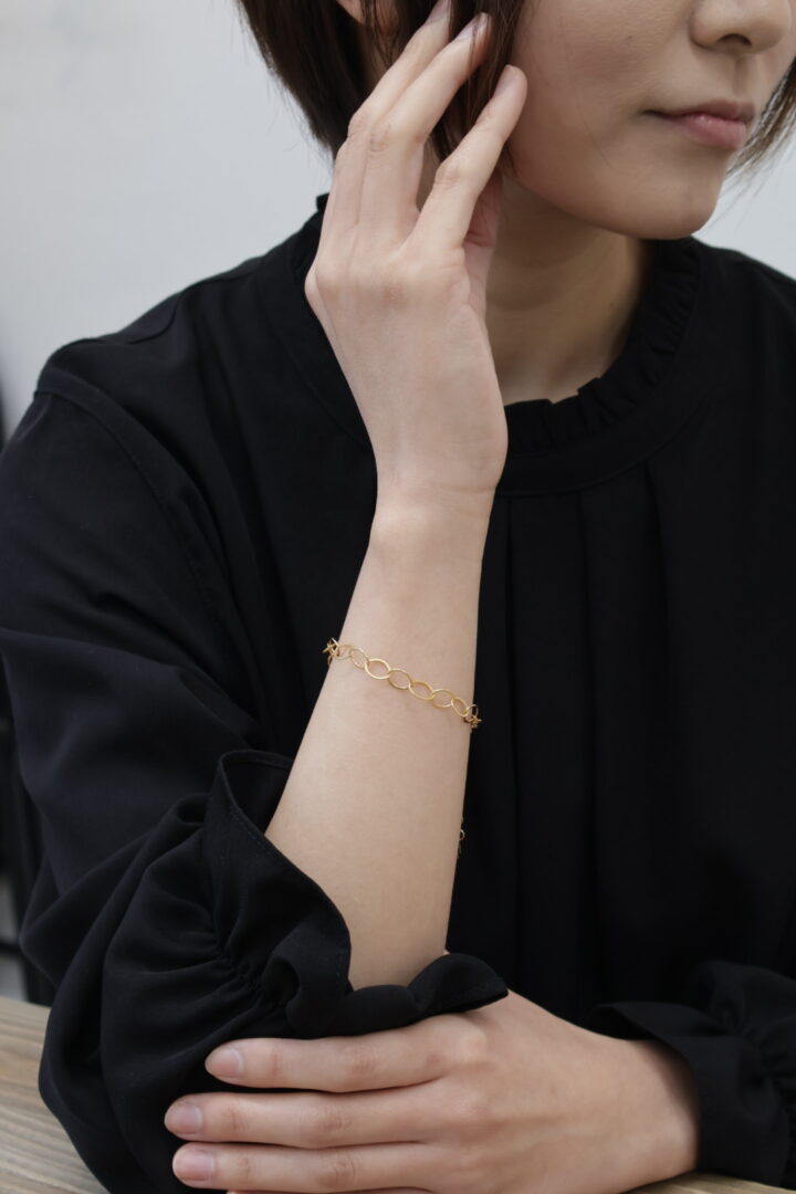 一つ一つ丁寧に繋げられたチェーンが、華やかなアクセントになり、どんなコーディネートにも合わせやすく着け心地も抜群で、日常使いにぴったりです。